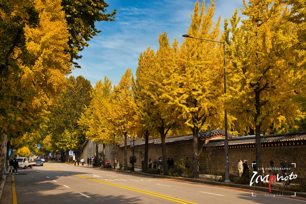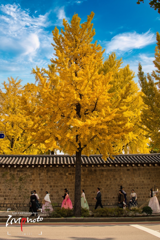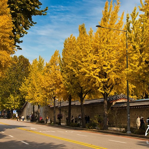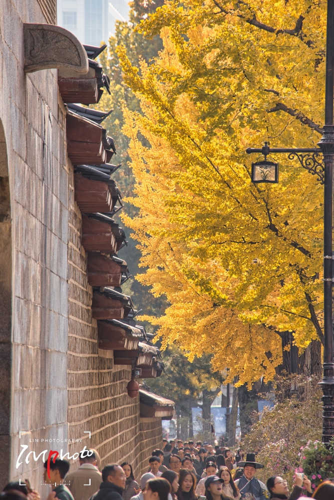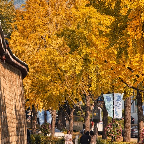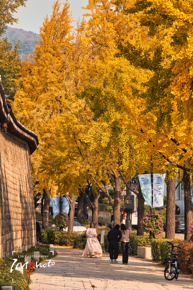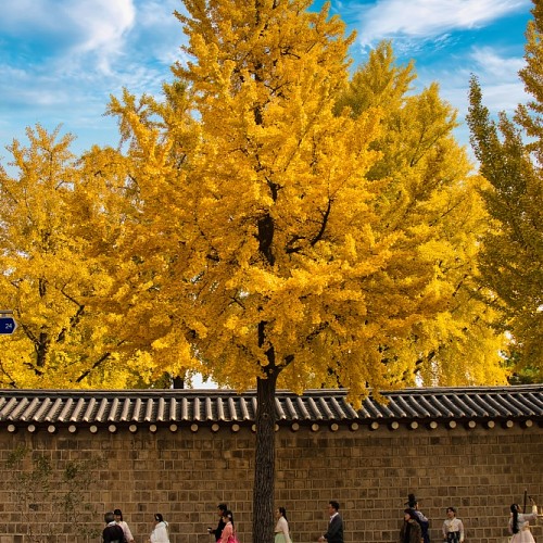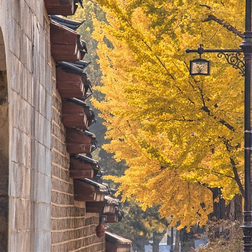 Ginkgo trees along the stone wall path of Gyeongbokgung Palace